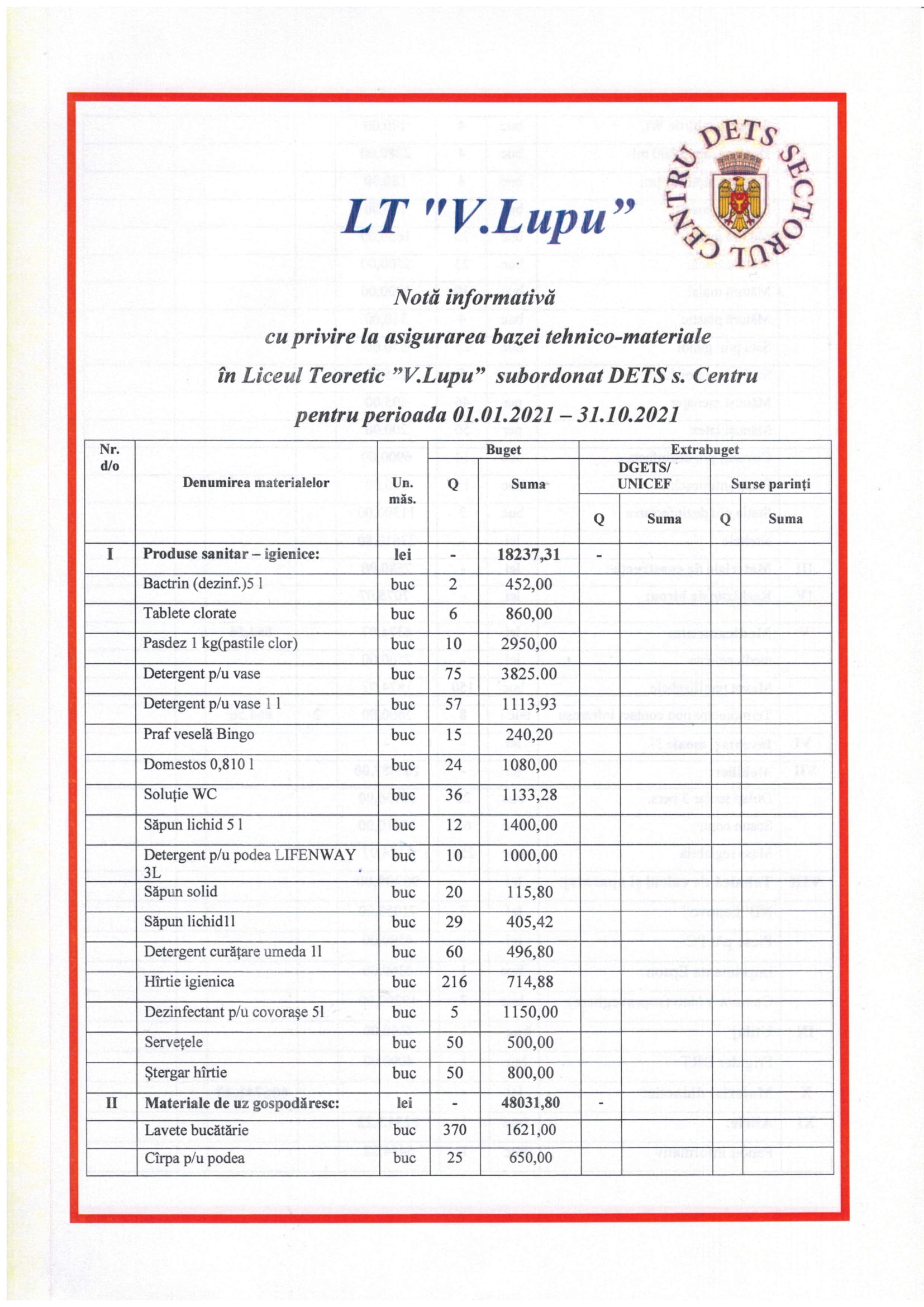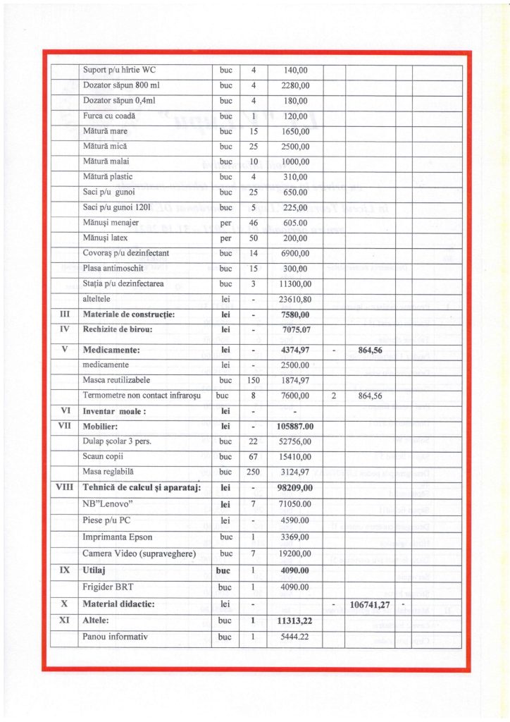 Asigurarea bazei tеhniсo – mаtеriаlе pentru perioada 01.01.2021-31.10.2021